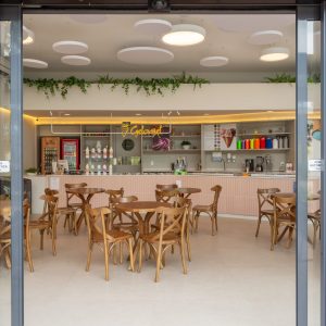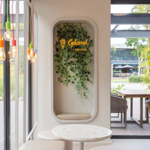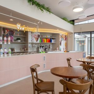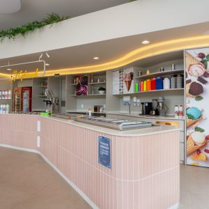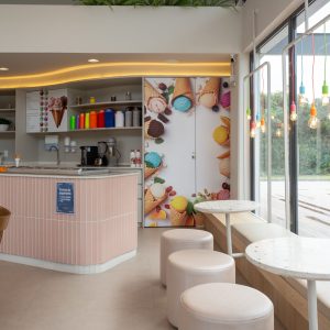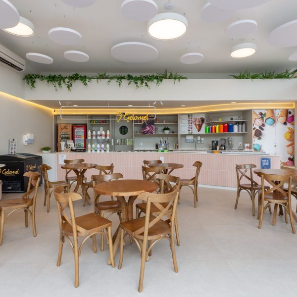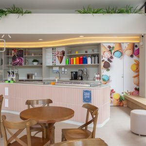 Projeto de interiores para a sorveteria Gelomel na Surfland Brasil, localizado em Garopaba.